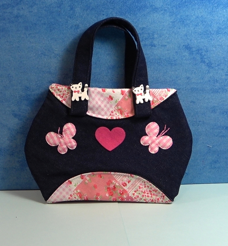 Sac unique enfant fait main. Matière de confection : Jeans, Coton, appliqué, bouton chat. Dimension 22x15m.