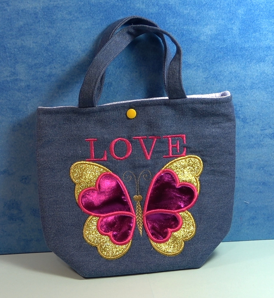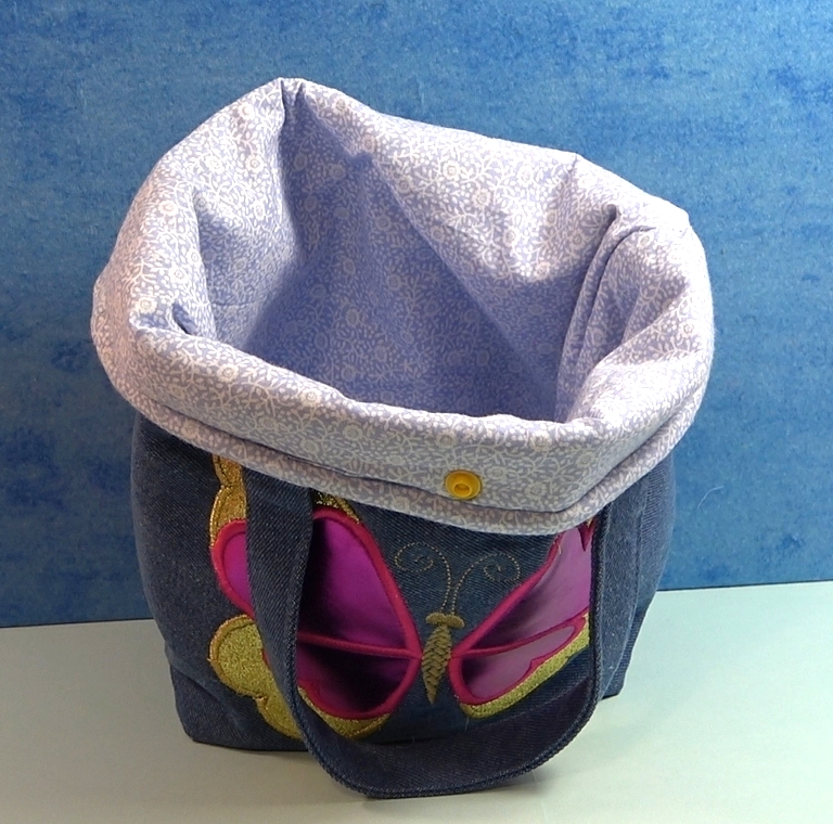 Sac unique enfant fait main. Matière de confection : Jeans, Coton, broderie, appliqué, bouton pression. Dimension 26x23m.