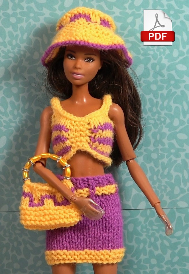 Explication complète au tricot. Elle comprend : le haut, la jupe, le chapeau et le sac.