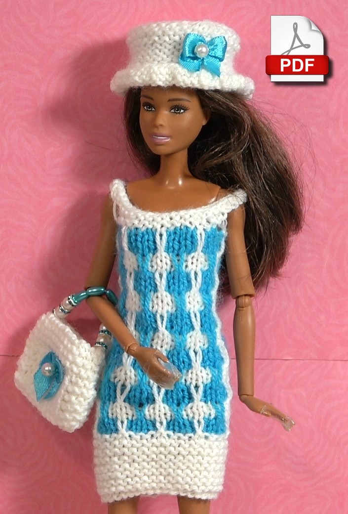Explication complète au tricot. Elle comprend : la robe, le chapeau et le sac.